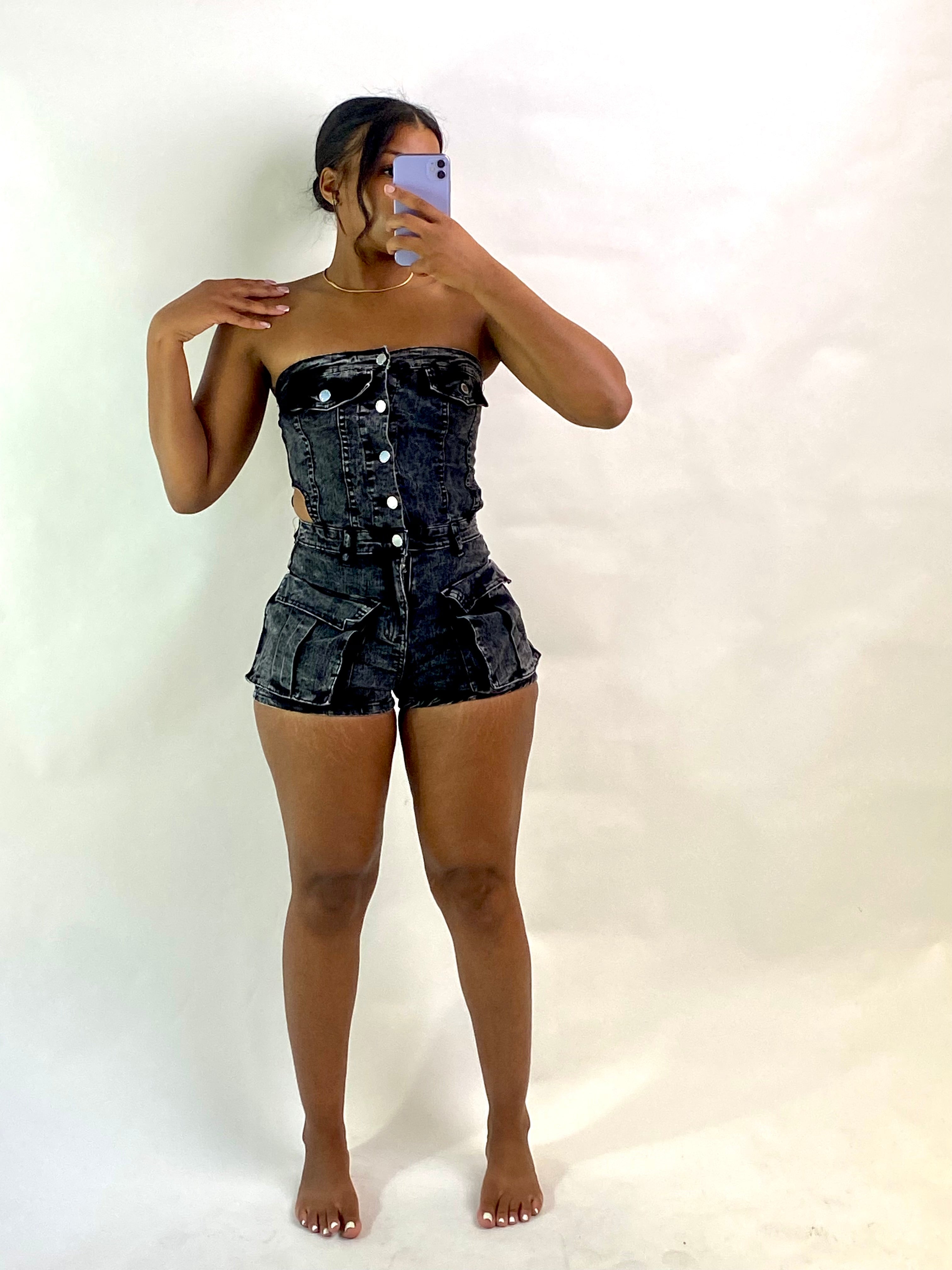 This denim romper is perfect for a special occasion or an outing. The acid denim and cargo look is very edgy and trendy! Available in sizes S,M,L. Colors Charcoal and bubblegum.